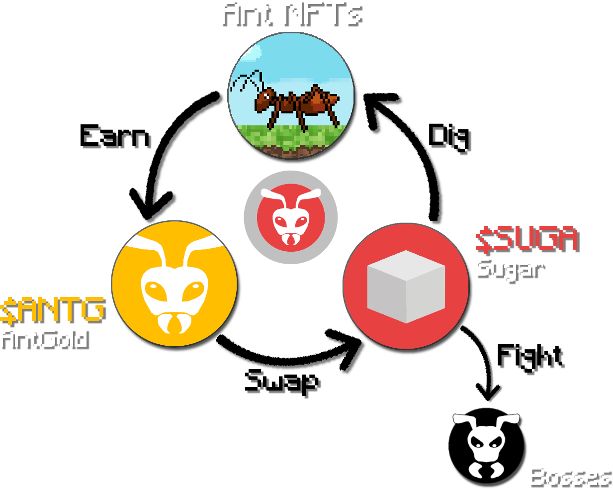 All 10,000 Ant NFTs produce $ANTG (AntGold) they can swap for$SUGA (Sugar). Eating sugar provides them energy to dig and earn more, also to fight as groups against bosses to loot rewards.